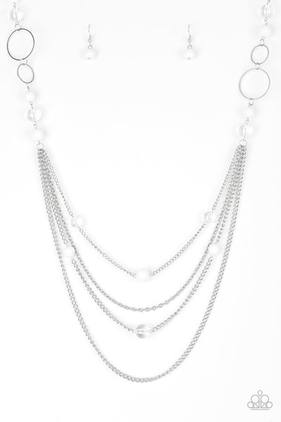 Infused with shimmery silver hoops, glassy and polished white beads trickle along glistening silver chains for a bubbly look. Features an adjustable clasp closure.