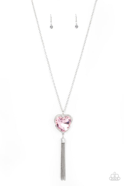 Bordered in a ribbon of glassy white rhinestones, an oversized pink heart-shaped gem seemingly floats at the bottom of an extended silver chain. A shimmery silver chain tassel dances from the bottom of the sparkly pendant for a flirtatious finish. Features an adjustable clasp closure.