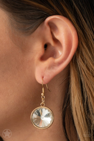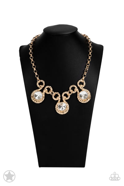Three dramatically oversized rhinestones are nestled into three textured gold fittings that are connected by oval gold rings, creating a brilliant statement piece. Features an adjustable clasp closure.