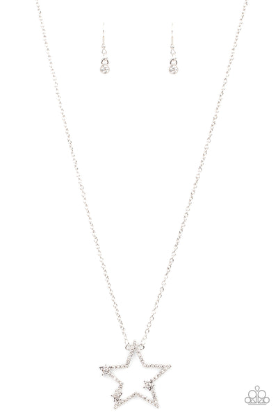 Dotted with glassy white rhinestone centers, a dainty trio of silver stars haphazardly dots the front of a white rhinestone encrusted silver star pendant for a stellar patriotic look. Features an adjustable clasp closure.