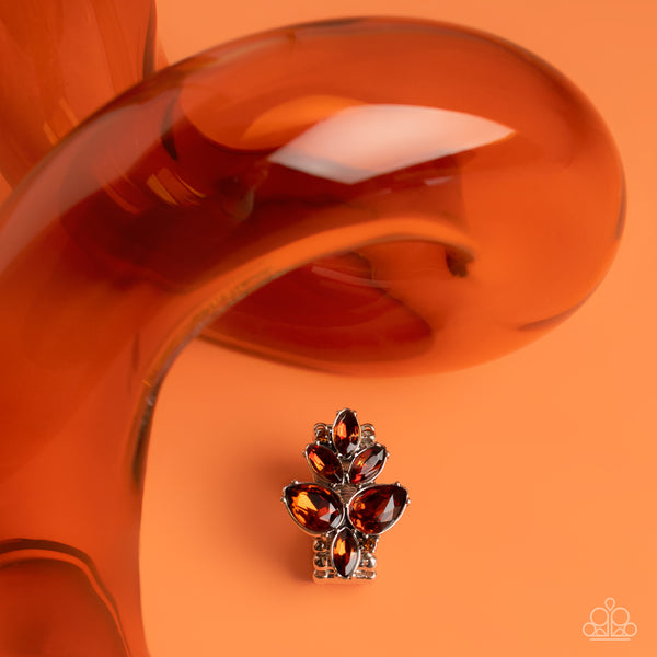 Shimmery brown teardrop gems, accented with glassy brown marquise-cut rhinestones, build into a fragmented cluster creating a glistening centerpiece atop the finger. Features a stretchy band for a flexible fit.