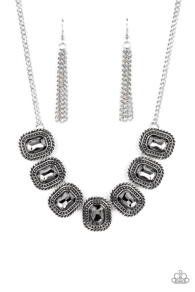 Pressed into silver, chain-like frames, radiant-cut hematite rhinestones smolder below the collar in a jaw-dropping finish. Features an adjustable clasp closure.