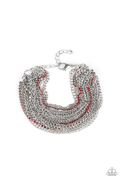 Infused with strands of glittery red rhinestones, strand after strand of shiny silver chains layer around the wrist for a dramatic shimmer. Features an adjustable clasp closure.