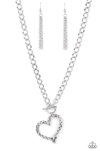 A hammered silver heart frame gently twists from a toggle closure at the bottom of a chunky silver chain, resulting in a romantically rustic pendant. Features a toggle closure.