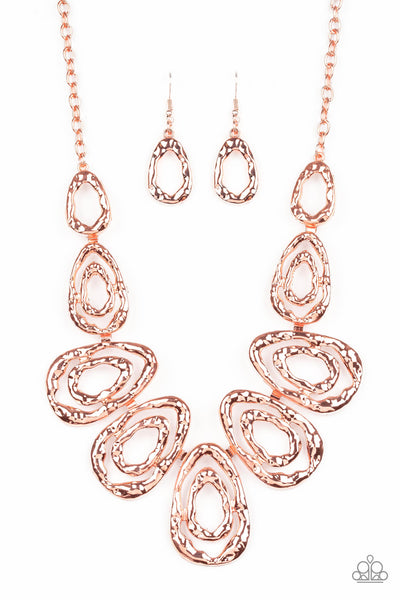 Delicately hammered in blinding shimmer, shiny copper bars spin into asymmetrical teardrops. The airy abstract frames link into a bold industrial statement piece below the collar. Features an adjustable clasp closure.